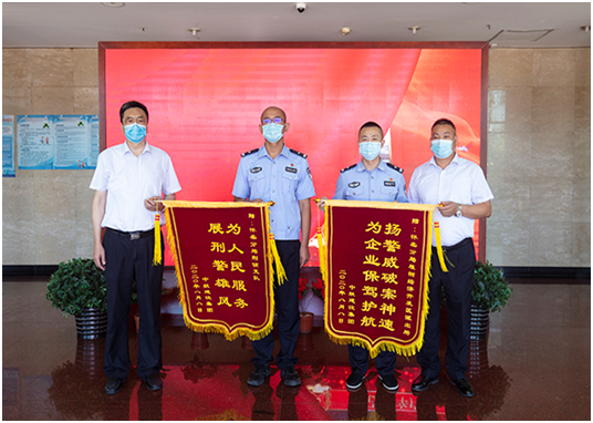培训中心主任孔德明代表华体会网页版向怀柔分局雁栖经济开发区派出所所长和怀柔分局刑侦支队支队长送上锦旗,代表公司感谢人民警察服务企业生产建设、守护一方平安付出的艰辛努力,感谢怀柔分局雁栖开发区派出所和怀柔分局刑侦支队急企业所急、想人民所想,在企业遇到困难时及时出警,有力保障了企业财产安全,维护了社会良好秩序,为企业发展创造了平安和谐的营商环境。